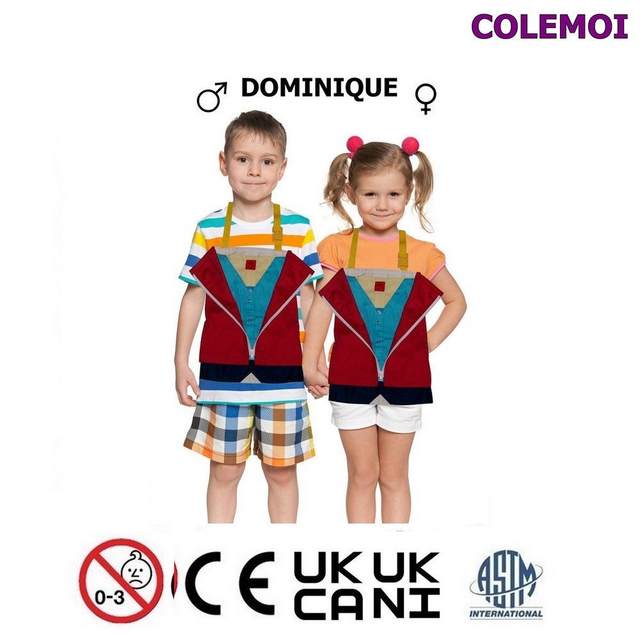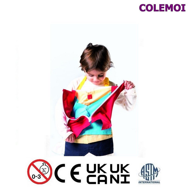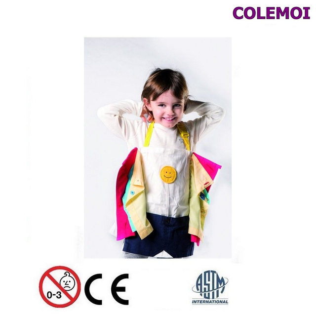 Starting 3 years, activity apron is used to learn how to dress and undress in a funny way by wearing the apron or to put it on a table.