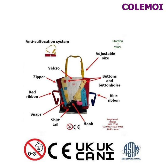 Starting 3 years, activity apron is used to learn how to dress and undress in a funny way by wearing the apron or to put it on a table.